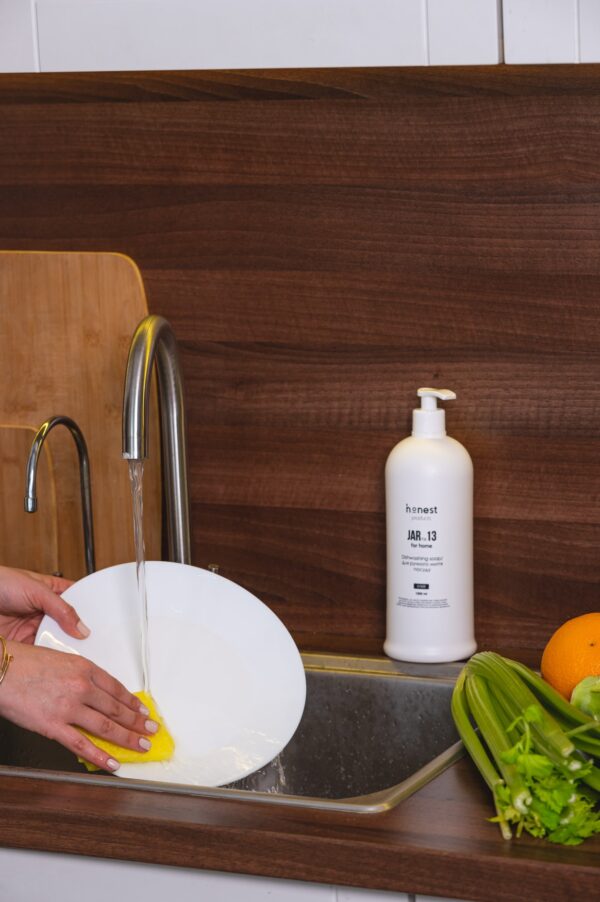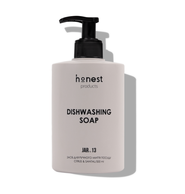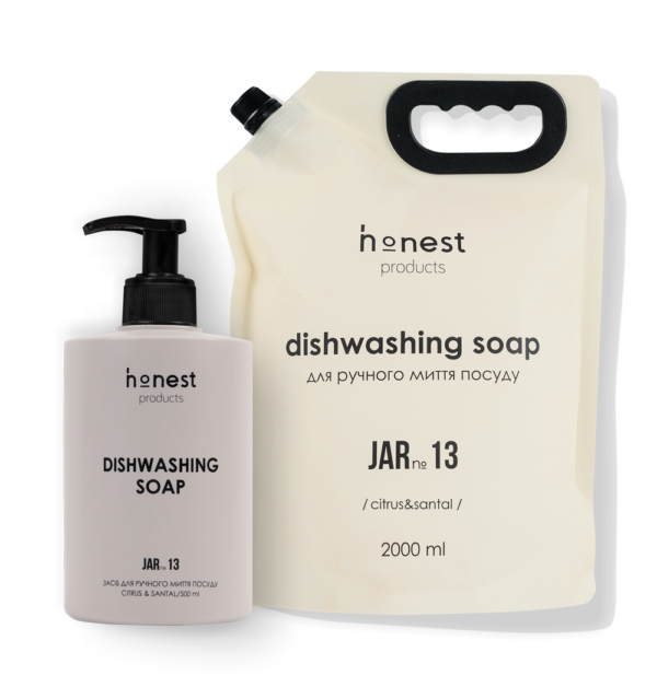 Ми рекомендуємо почати прибирання з миття посуду. honest products JAR №13 делікатний засіб для ручного миття посуду з витонченими нотками арганового дерева суттєво полегшить процес відмивання посуду, розчинить жир і плями, зручний та економічний у використанні. Містить речовини, що знижують негативний вплив на шкіру рук.