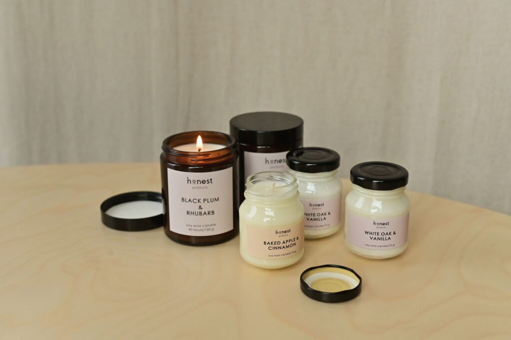 – соєвий віск: екологічно чистий і вигоряє довше і чистіше порівняно з традиційним парафіном. До прикладу соєва свічка – black plum з ароматом чорної сливи та ревеню від українського бренду honest products;