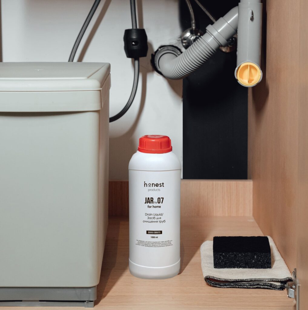 3. Хімічні засоби: використання спеціальних хімічних засобів для прочищення труб є одним з найпоширеніших методів. Рідини або порошки, що містять хімічні розчинники, можуть швидко розчинити жир, волосся та інші відкладення. Однак слід дотримуватися інструкцій та застерігатися можливих агресивних хімічних речовин. До прикладу, JAR for home №07 – засіб для прочищення труб раковини, каналізаційних труб та сифонів від українського бренду honest products. Він ефективно усуває засмічення та розчиняє органічні речовини: волосся, жир, залишки їжі.